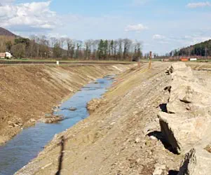 Die neuen beidseitigen Uferbereiche weisen je nach Bestockung verschiedene Neigungen auf. In der Regel wird die Uferseite bestockt, wo sich die