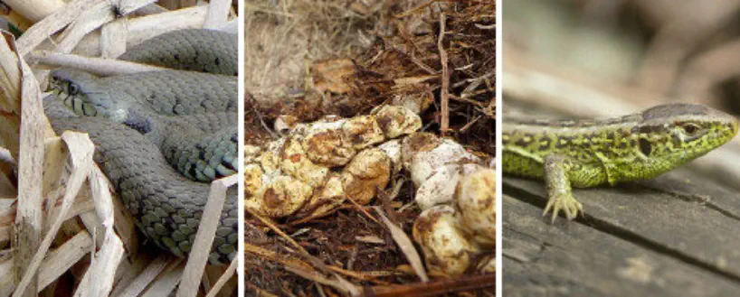 Ringelnatter, Streuehaufen als Eiablageort, Zauneidechse (v.l.n.r.).